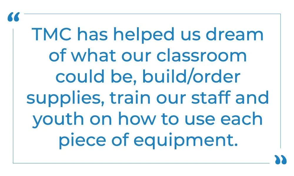 My favorite part of our collaboration has been watching how skilled the staff are at TMC. Many of them have experience working with at risk youth. Many have experience working with kids who struggle with mental health and/or learning. Watching TMC staff collaborate with our staff and youth in a meaningful way has provided hope for everyone. Our staff sees the value in working with the youth in the CTE classroom and have experienced improvements in rapport building and individual counseling time.
